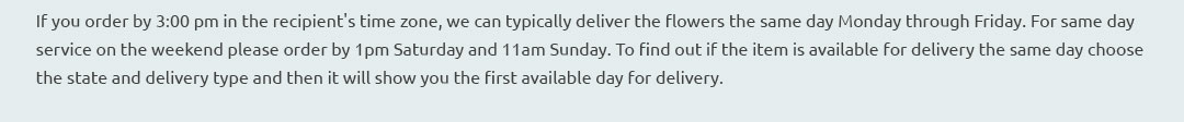 Same Day Delivery. Order by noon in your recipient's time zone for Same Day or by midnight for Next Day delivery. https://www.floom.com/us/shop/flowers